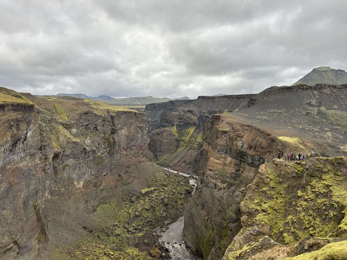 De laatste etappe serveert je een typisch IJslandse mix: gletsjers, lavavelden, fluogroen mos, rood zand… Net voor Thórsmörk wacht trouwens nog een pittige rivierdoorsteek. De rivier is breed, diep en verraderlijk. Neem hier zeker de tijd om een veilige route te kiezen en bereid je goed voor – haast en spoed is hier geen goede raadgever.
