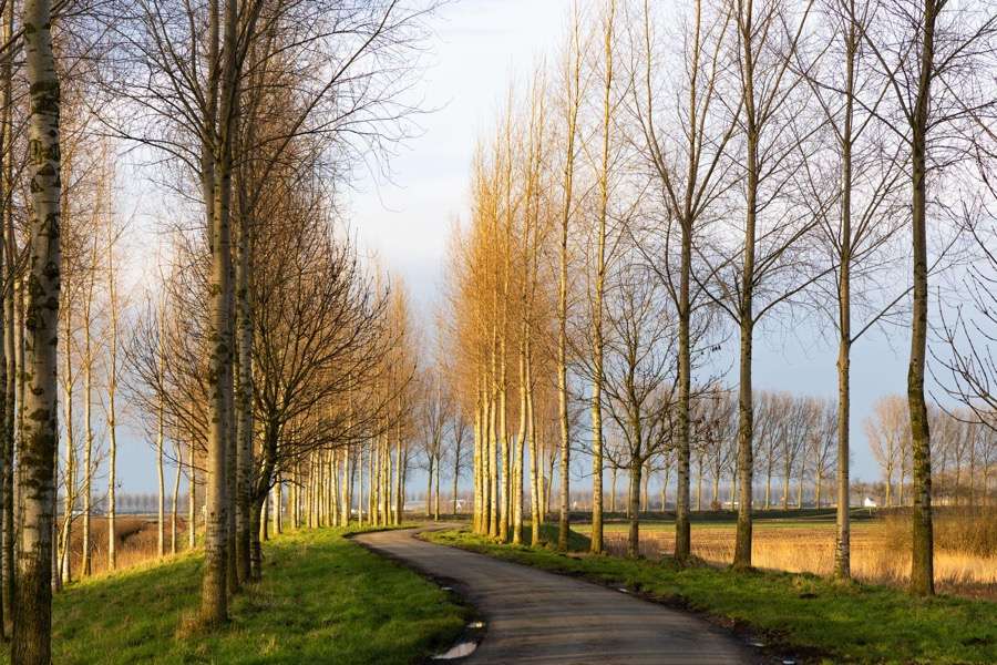 We keren het beeld de rug toe en voelen nog even de blik van een van de vossen voordat we ons weer verschuilen achter de hoge dijk met populieren. Soms is er een plukje bos en soms een wiel, dat is een soort meertje ontstaan door een dijkdoorbraak. Verder is het landschap gestructureerd en klaar voor het volgende seizoen om uiteindelijk weer te oogsten van de vruchtbare gronden. We verbazen ons over de rust in dit landelijke gebied dat op een paar stukjes natuur na onder invloed van mensenhanden is ontstaan. In de tijd van Reinaert was het landschap nog niet in cultuur gebracht. De schrijver van het boek heeft de plek in Reinaerts leugenachtige verhaal omgevormd tot een plek waar geen levende ziel wil komen, waar alleen nachtvogels huizen en waar honger en kou geleden wordt. Het was dus een hachelijke onderneming om de vos te vangen. Ondanks de donkere wolken vandaag, ziet het er nu een stuk rooskleuriger uit dan in de donkere middeleeuwen. Gelukkig maar.