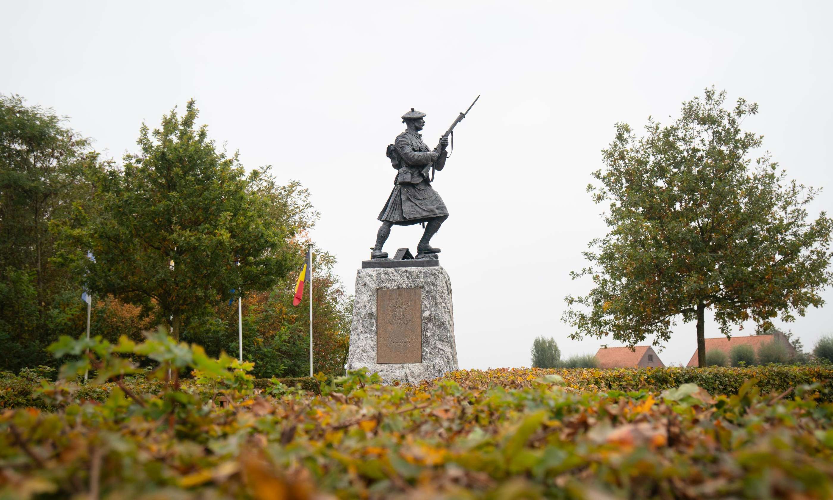Nog zo’n opmerkelijk monument aan de rand van het Polygoonbos is de Black Watch Corner, een standbeeld(zie coverfoto) dat verwijst naar de Schotse elite-eenheid die meevocht in WO I en die een belangrijke rol speelde bij het stoppen van de Duitse opmars richting Ieper in de winter van 1914. De Black Watch was namelijk een Schotse infanterie-eenheid, waarvan de naam verwijst naar de donkere kilt die de soldaten droegen. Tijdens WO I vochten heel wat bataljons van de Black Watch samen met de geallieerden en werden ze door de Duitsers soms ‘Ladies from Hell’ genoemd.